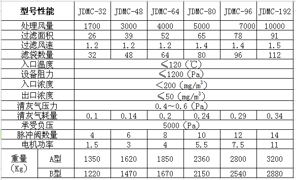 JDMC袋式除塵器 單機脈沖袋式除塵器采用逐行脈沖噴吹的清灰方式,其結構由過濾室、濾袋、凈氣室、灰斗、卸灰裝置、脈沖噴吹清灰裝置、電控系統組成具有清灰效果好、凈化效率高、濾布壽命長、維修工作量小、運行安全可靠等優點。廣泛用于冶金、建材、化工、機械、礦山等各種工礦企業非纖維工業粉塵的除塵凈化與物料的回收。 主要特點是: ◆該設備有體積小,處理風量大,結構緊湊,使用方便、安全可靠等優點。 ◆用滌淪氈等各種濾料,正常使用溫度<120℃(溫度根據客戶要求制作)入口含塵濃度<200glNM。出口排放濃度<50mglNM3。 ◆適用于運輸機、提升機、庫頂、庫底、包裝機、熟料破碎等處除塵。 ◆采用高壓大流量脈沖閥逐條濾袋噴吹清灰的技術,其它單機相比,具有清灰動能大,清灰效率高的特點。