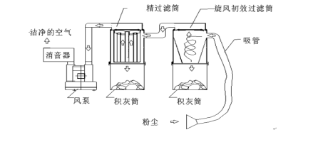 ① 兩級除塵,旋風初效過濾+精過濾,兩級除塵可以大量清理、回收、像氧化鋁粉、水泥等較細的粉塵,也可以吸水、吸油。