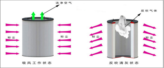 ⑤脈沖反吹式清灰 該設備內置氣包,脈沖閥等噴吹裝置,可利用高壓空氣在濾芯工作一段時間后,及時將濾芯表面的粉塵清理掉。以保證設備連續運行吸力不會減小。
