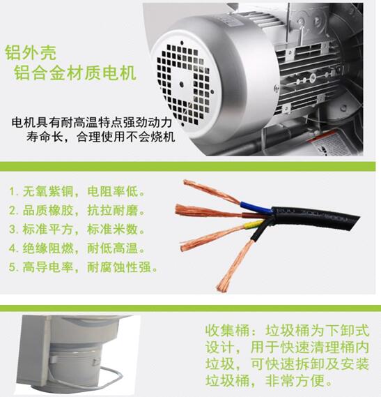 SL-D系列工業吸塵器的采用了美觀簡潔的外觀設計,是在保障設備具有強大的吸力的前提下,體現了該機操作簡單,移動靈巧的特點。它裝有300毫米的前輪,可適應復雜不平路面的移動,后輪為雙萬向輪,并帶有剎車,使機器在帶有坡度(坡度不能大于30度)的場所同樣保持穩定工作。機身的前端設計有散熱窗,能有效的散發電機在工作中產生的熱量。底座上配有防靜電鏈,可以將靜電接地,解決了機器在工作過程中產生的靜電,獨特的靜音設計使設備噪音不大于75分貝。設備電機采用的是380V電源,電器仍具有過載、過流、缺項保護裝置。機器配有多種吸嘴,可根據不同的環境,清理不同的灰塵或垃圾。快速裝卸分離集灰桶裝置,讓清灰更方便。