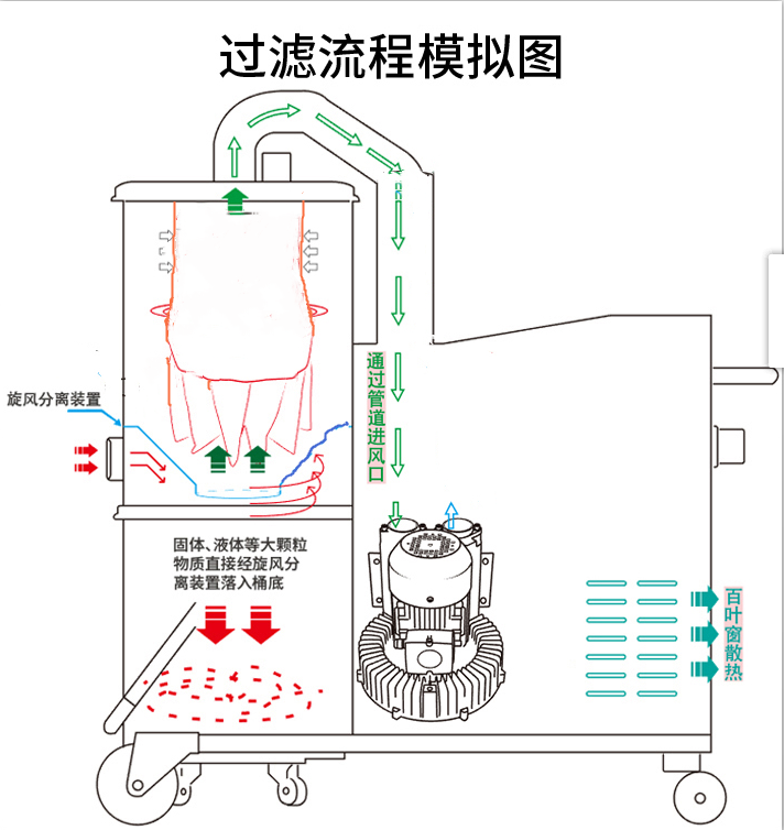 ⑥ 吸鐵屑用工業(yè)吸塵器動(dòng)力系統(tǒng)為保證設(shè)備的高壓動(dòng)力、持續(xù)續(xù)航。風(fēng)機(jī)方面采用國(guó)際先進(jìn)的精鑄渦輪風(fēng)泵,.此款風(fēng)泵采用了風(fēng)冷式雙旁路(Bypass)的散熱系統(tǒng),這樣的設(shè)計(jì)可以讓電機(jī)和風(fēng)泵在使用過(guò)程中一直保持恒 溫狀態(tài),使電機(jī)可連續(xù)工作24小時(shí)。 風(fēng)泵進(jìn)、出風(fēng)口處安裝有多頻消音器,讓您有一個(gè)安靜的工作環(huán)境。電機(jī)采用國(guó)產(chǎn)西門子電機(jī),寬壓雙頻(50/60Hz),高可靠、低噪音、長(zhǎng)壽命。